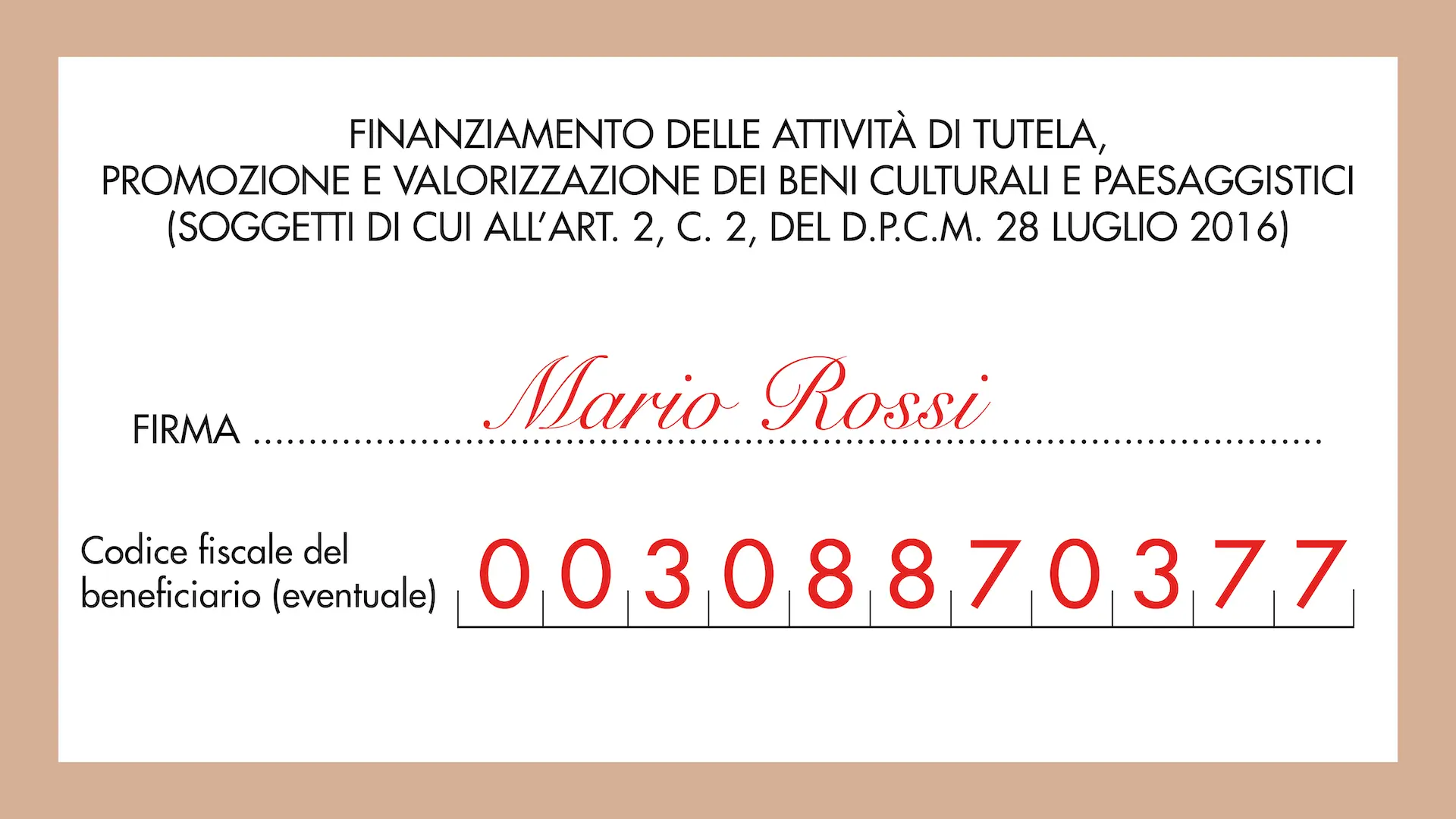 Cerca la sezione “Scelta per la destinazione del 5×1000” sul modello per la dichiarazione dei redditi (CU, 730 o UNICO) e compila il riquadro che riporta la dicitura “FINANZIAMENTO DELLE ATTIVITÀ DI TUTELA, PROMOZIONE E VALORIZZAZIONE DEI BENI CULTURALI E PAESAGGISTICI (SOGGETTI DI CUI ALL’ART. 2, C. 2, DEL D.P.C.M. 28 LUGLIO 2016)