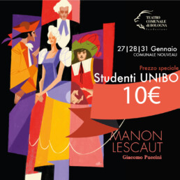 Biglietti a 10€ per tutti gli studenti iscritti all’Università di Bologna, all’Accademia di Belle Arti di Bologna e al Conservatorio di Musica Giovan Battista Martini, in vendita solo presso la biglietteria del Teatro Comunale negli orari di prevendita (dal martedì al venerdì dalle 12.00 alle 18.00 e il sabato dalle 11.00 alle 15.00) da un mese prima della “Prima” di ogni Opera, presentando il badge universitario e l’autocertificazione di iscrizione all’anno in corso.
