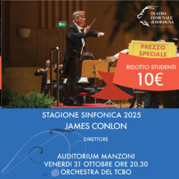 Biglietti a 10€ per tutti gli studenti iscritti all’Università di Bologna, all’Accademia di Belle Arti di Bologna e al Conservatorio di Musica “Giovan Battista Martini”, per tutti i concerti della Stagione Sinfonica 2025 in vendita da una settimana prima di ogni singolo concerto, presentando il badge universitario e l’autocertificazione di iscrizione all’anno in corso. È possibile usufruire della riduzione solo negli orari di prevendita della Biglietteria del Teatro in Largo Respighi, 1 (dal martedì al venerdì dalle 12.00 alle 18.00 e il sabato dalle 11.00 alle 15.00).