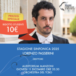 Biglietti a 10€ per tutti gli studenti iscritti all’Università di Bologna, all’Accademia di Belle Arti di Bologna e al Conservatorio di Musica “Giovan Battista Martini”, per tutti i concerti della Stagione Sinfonica 2025 in vendita da una settimana prima di ogni singolo concerto, presentando il badge universitario e l’autocertificazione di iscrizione all’anno in corso. È possibile usufruire della riduzione solo negli orari di prevendita della Biglietteria del Teatro in Largo Respighi, 1 (dal martedì al venerdì dalle 12.00 alle 18.00 e il sabato dalle 11.00 alle 15.00).