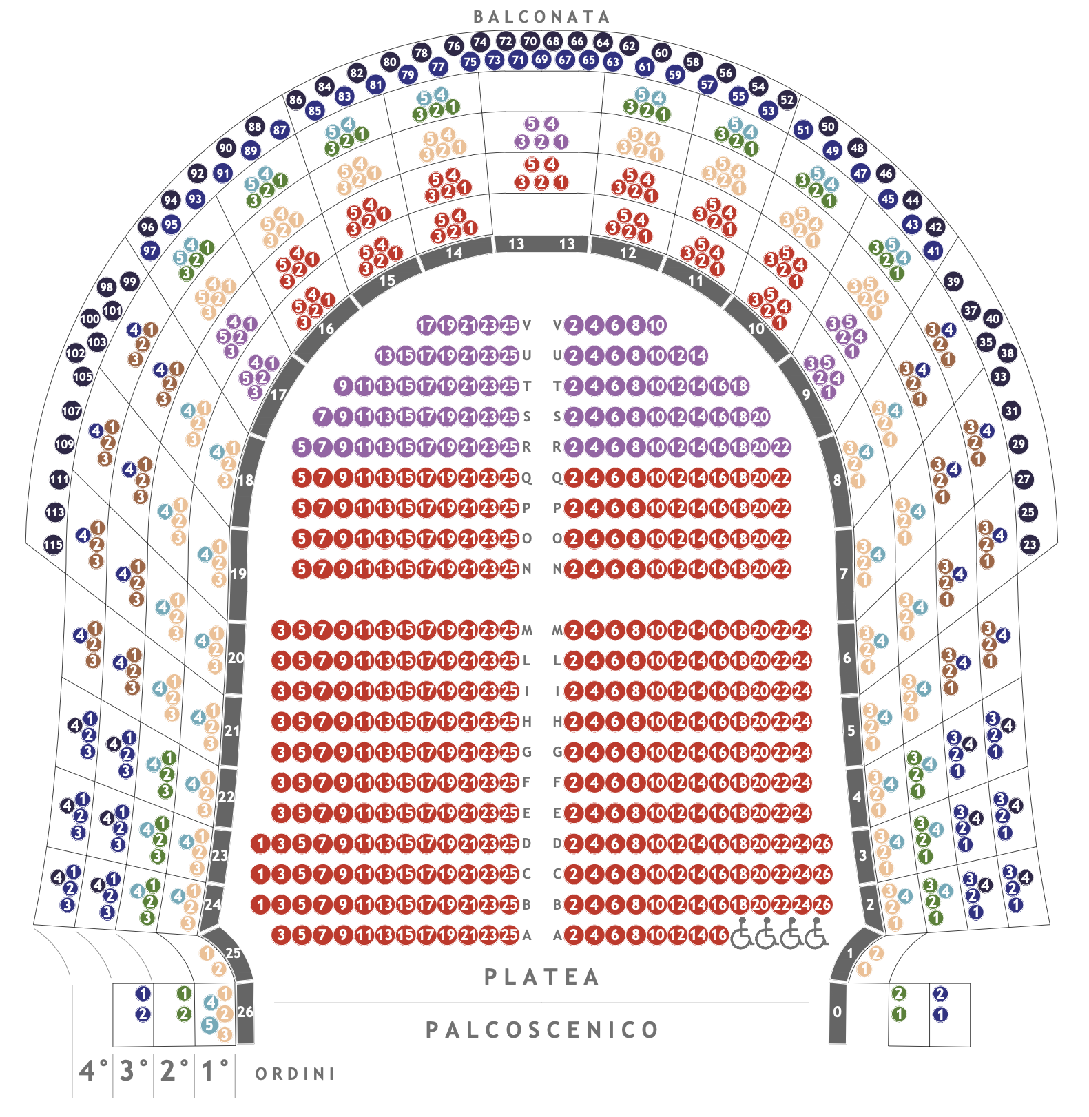 – posti davanti dei palchi dal 2 al 4 e dal 22 al 24 del III e IV ordine laterale